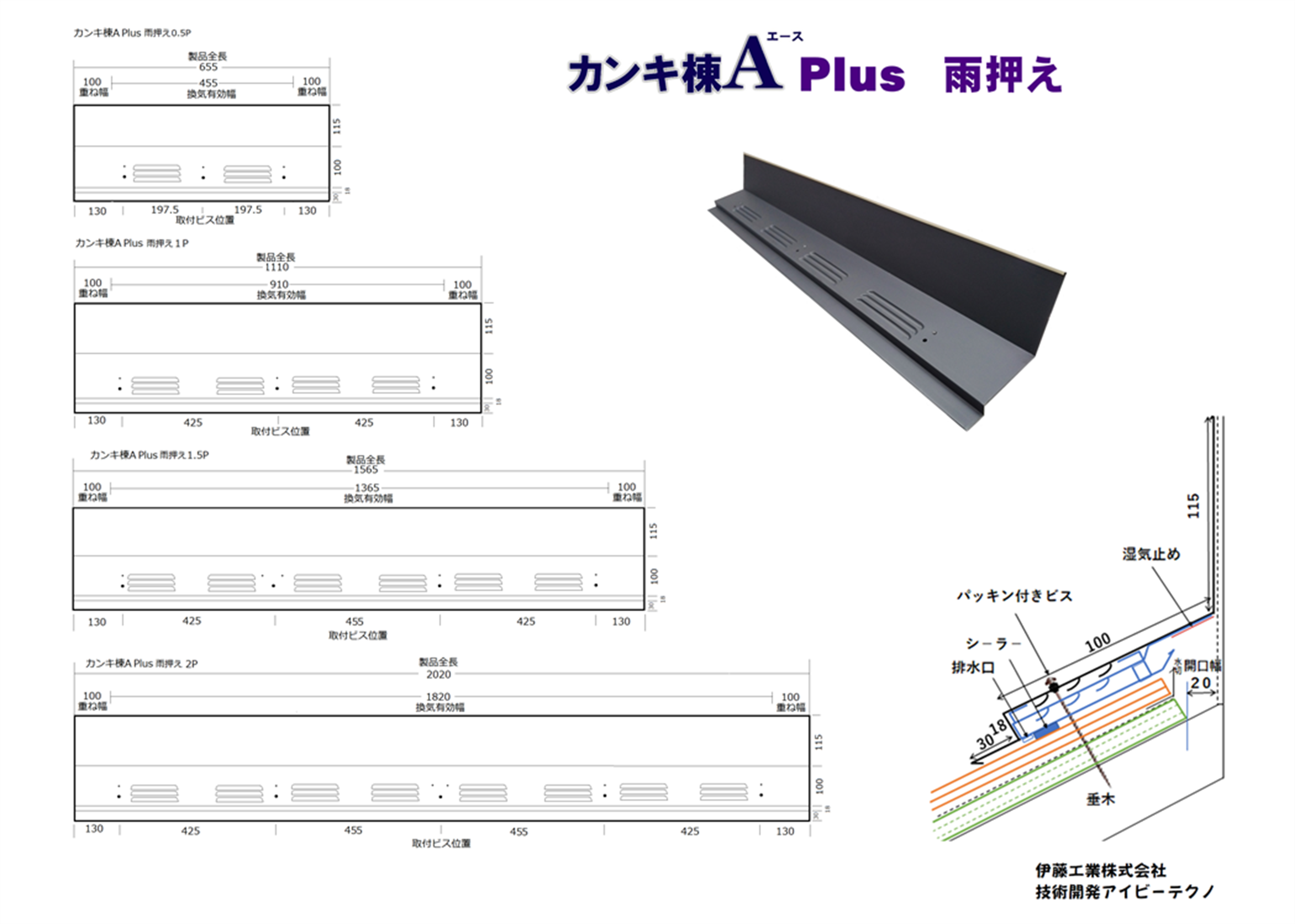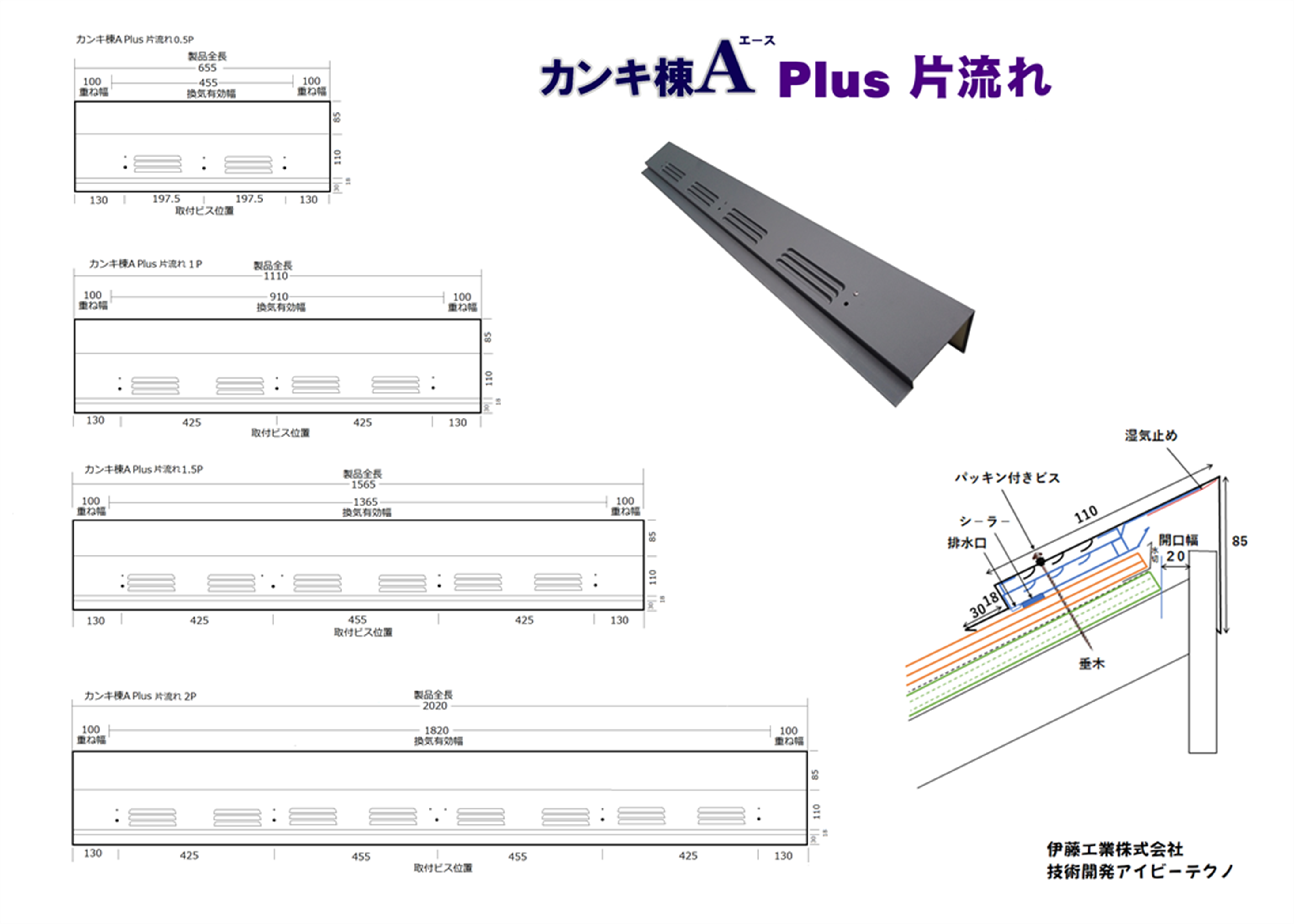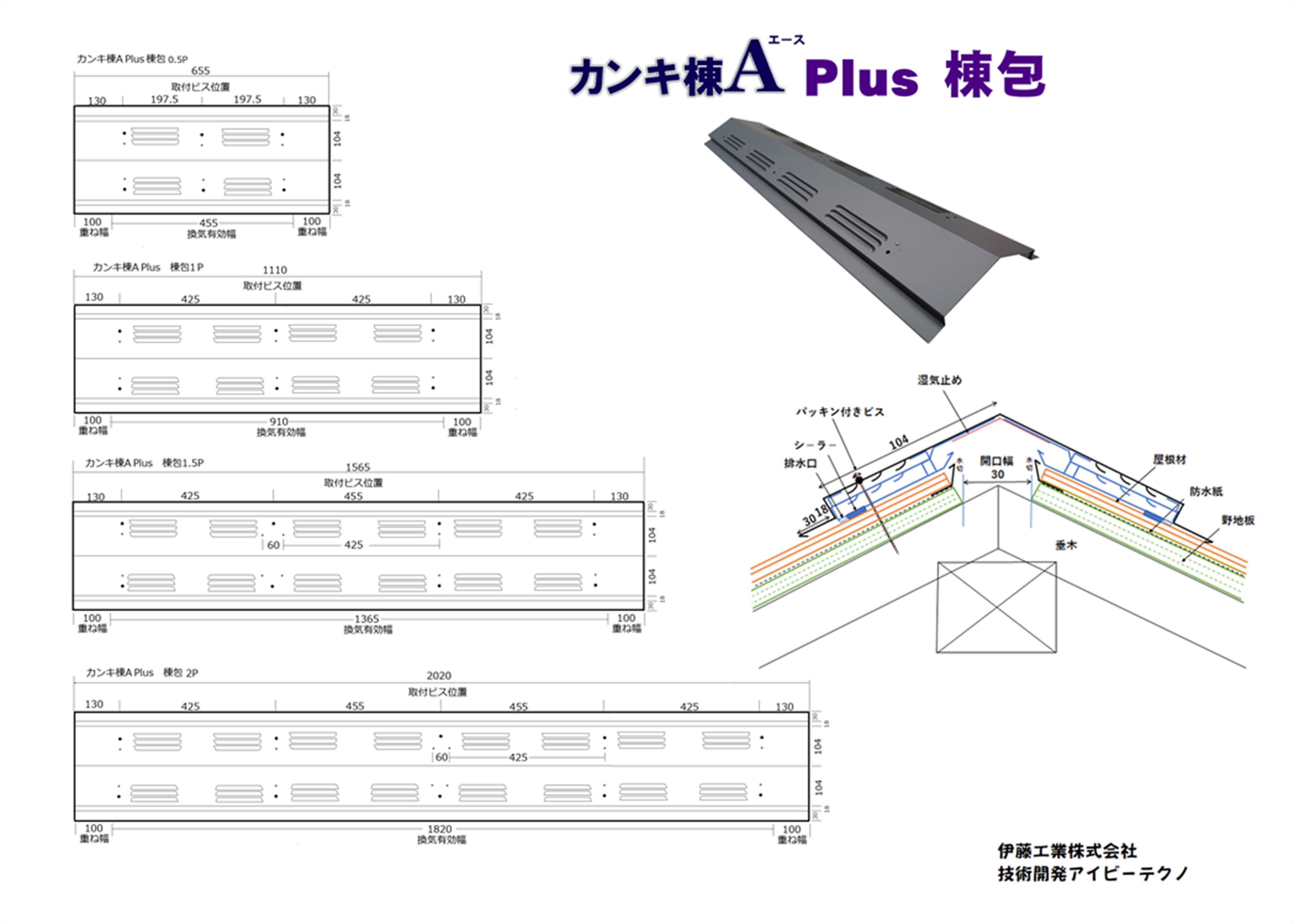カンキ棟Aが板金に内蔵したカンキ棟APlusが新登場! 形状は、【棟包】【片流れ】【雨押え】の3タイプ 長さは0.5P,1P,1.5P,2Pの4パタ-ン材質は、カンキ棟Aに採用した最新のZAM鋼板とガルバニウム鋼板をご用意。従来のカンキ棟A同様棟包1Pで有効換気面積37.76㎡で抜群の換気能力を発揮します。 カンキ棟A Plus ご注文フォ-ム